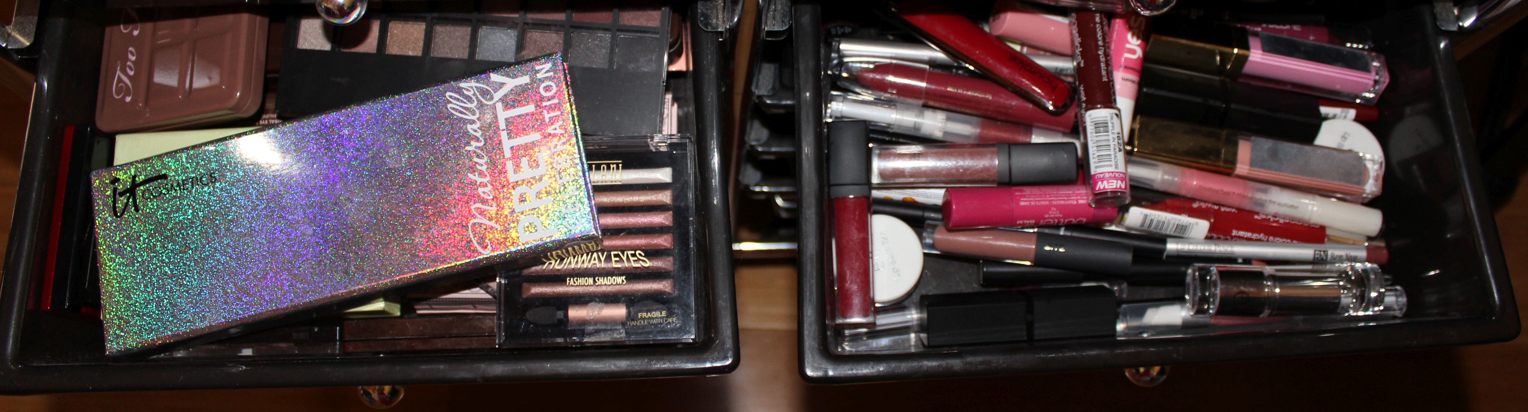 Then, face products (highlights, concealers, etc) on the left and the first drawer of eye shadow palettes on the right.  Eye shadow palettes get two drawers (natch) and then we have the lip glosses and balms.